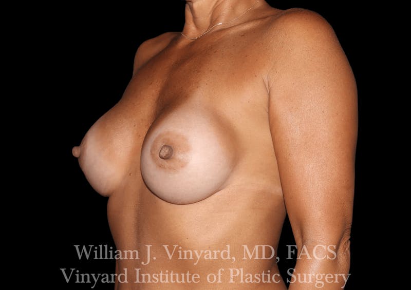 45-54 year old female treated with a Breast Augmentation using silicone gel implants. Patient was unhappy with the shape and fullness of her breasts and after going through a major life change, wanted to get breast implants to improve her self confidence. Dr. Vinyard used Allergan Natrelle Soft Touch silicone gel implants to acheive the patient's aesthetic breast goals.