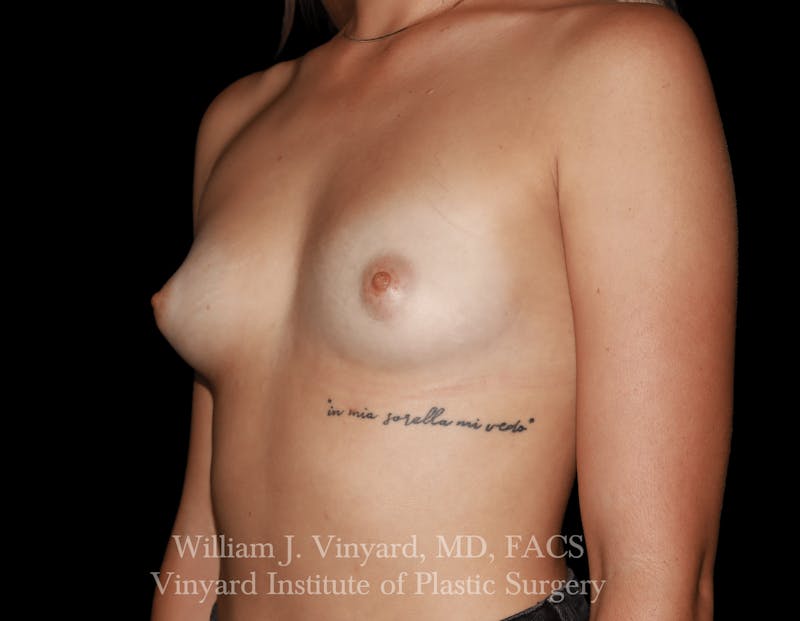 25-34 year old female treated with a Breast Augmentation with silicone gel breast implants. Patient was unhappy with the size of her breasts and wanted a breast enlargement so that she could wear clothes more comfortably and increase her self confidence. Dr. Vinyard used Allergan Natrelle Soft Touch Silicone Gel implants to achieve the patient's aesthetic breast goals.